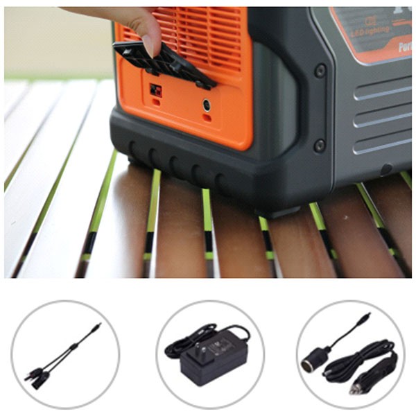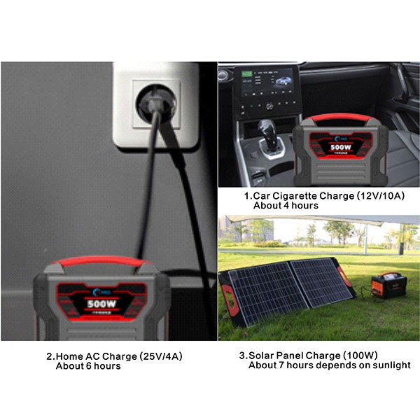 ● three charging methods: solar charge 100w, ac charging 100w, car cigaratte charge 120w. it is easy to be charged fully within 4~6 hours.